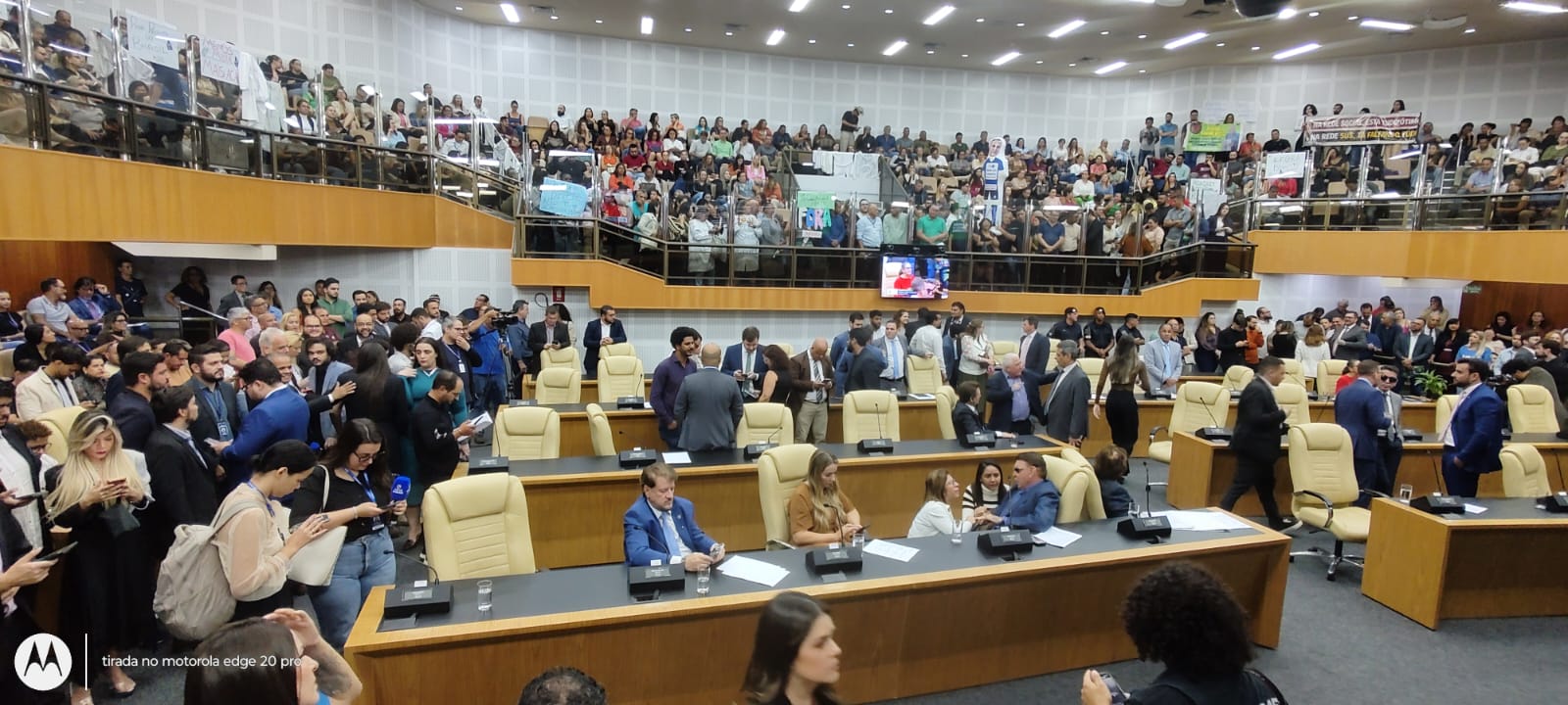 A sessão foi marcada por clima de tensão, com presença de manifestantes da área da saúde, cartazes, balões e vaias direcionadas à base governista.
