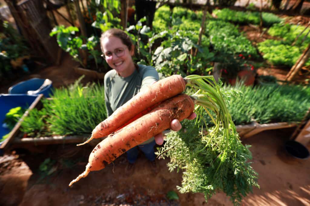 Nas mãos de Ihasminy Teixeira, uma muda de hortaliça representa mais que o início de uma plantação.
