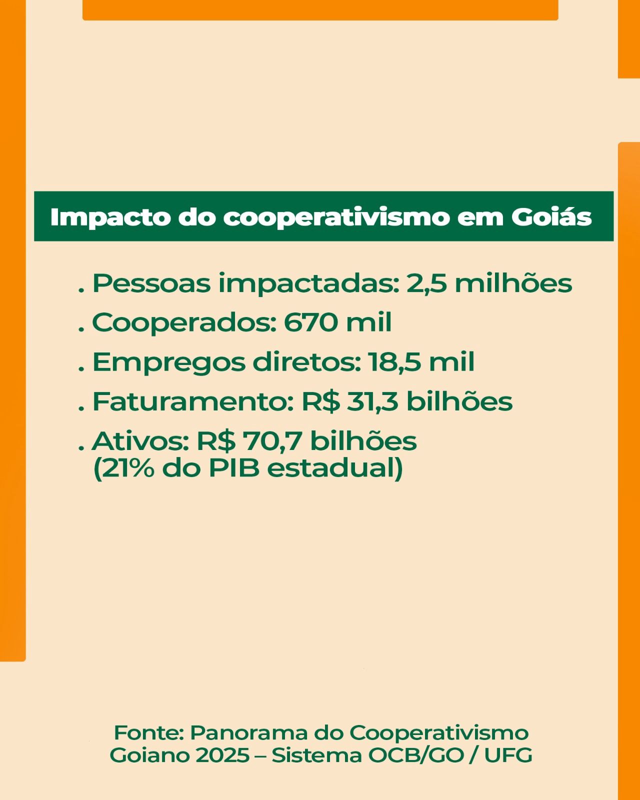 De acordo com o Panorama do Cooperativismo Goiano 2025, realizado pelo Sistema OCB/GO em parceria com a Universidade Federal de Goiás (UFG), em 2024, as cooperativas geraram 18,5 mil empregos diretos, registraram faturamento de R$ 31,3 bilhões e acumularam ativos de R$ 70,7 bilhões, equivalentes a 21% do Produto Interno Bruto (PIB) estadual.