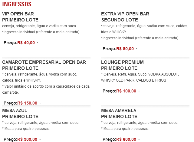 Ingressos antecipados – Valores sujeito a alterações sem aviso prévio!