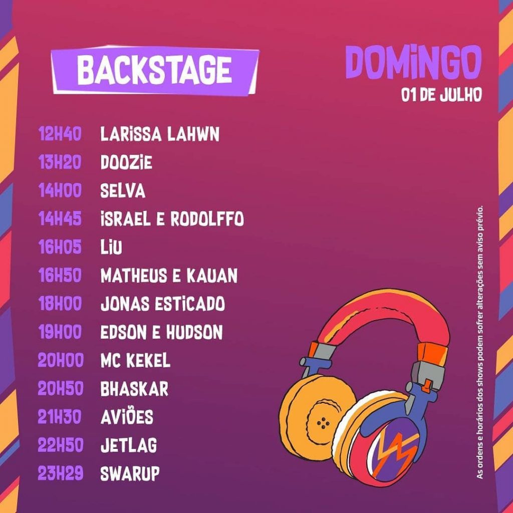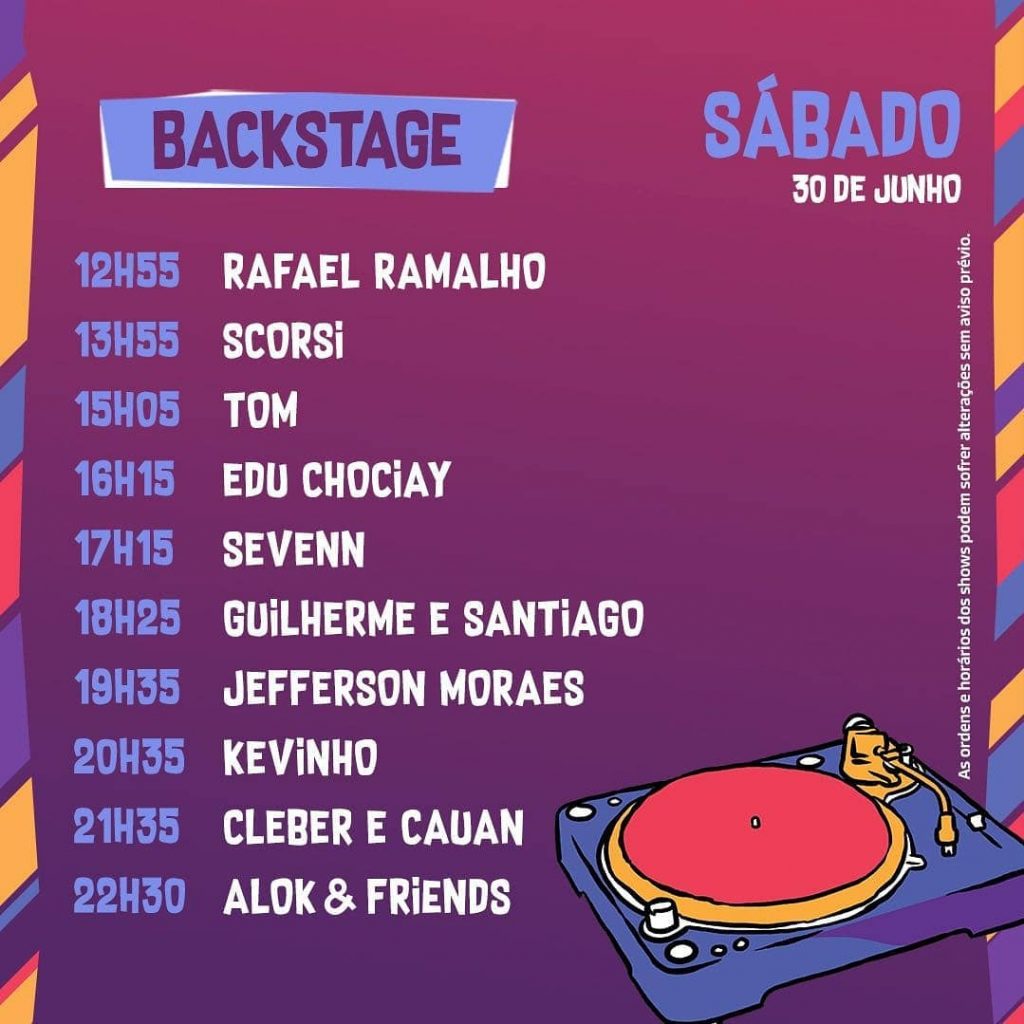 Já no setor backstage, agitarão a galera Alok, Cleber & Cauan, Edu Chociay, Guilherme & Santiago, Jefferson Moraes, Kevinho, Rafael Ramalho, Scorsi, Sevenn e Tom.