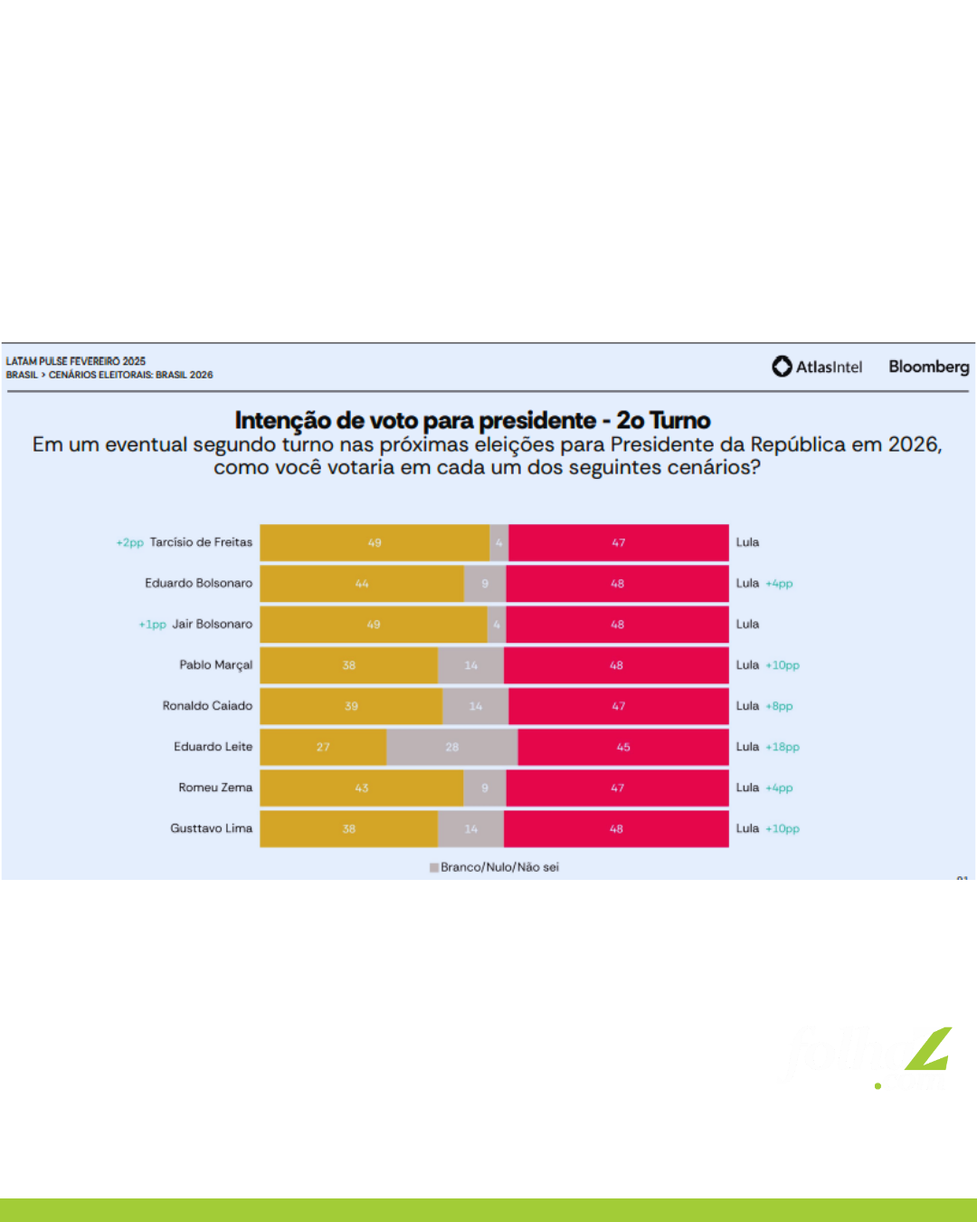 O Instituto Atlas Intel, em parceria com a Bloomberg, testou 8 cenários de 2º turno com o presidente Lula (PT).