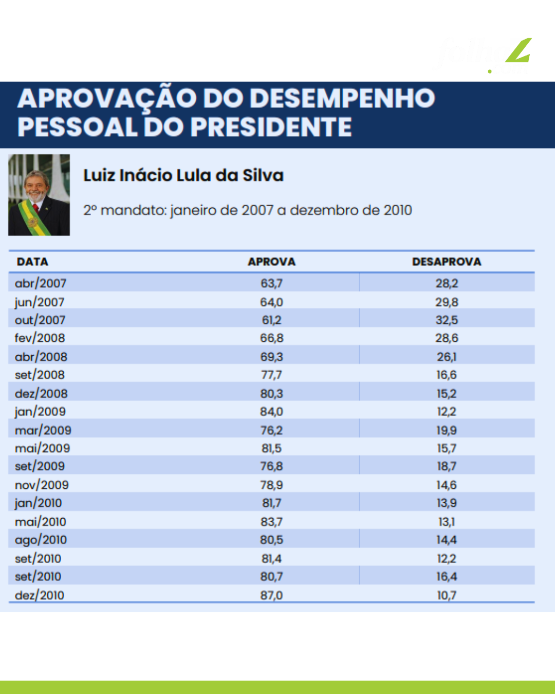 Já sua maior aprovação foi registrada no final de seu segundo mandato, em 2010, quando 87% dos entrevistados aprovavam sua gestão, contra 10,7% de desaprovação.
