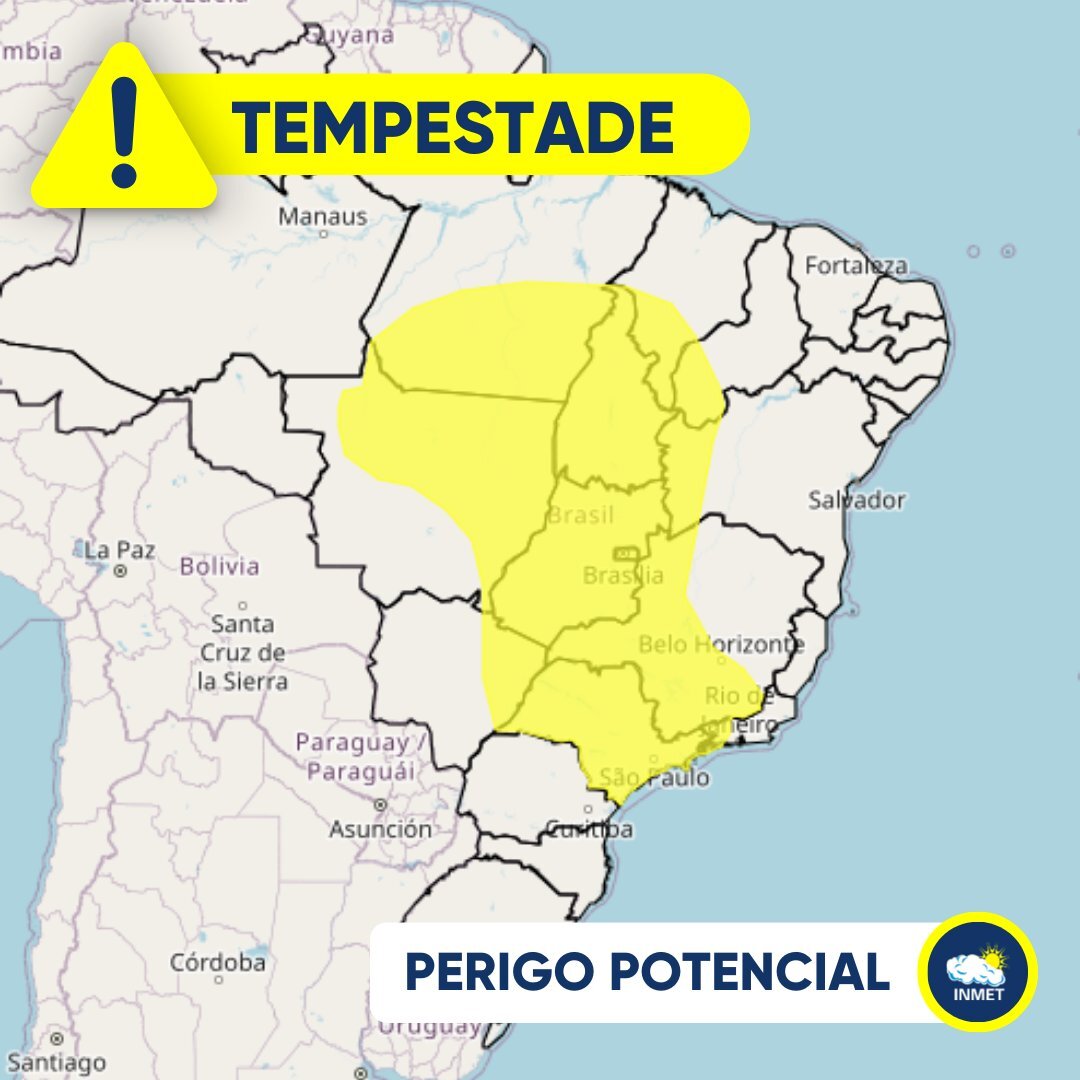 Para esta 6ª feira (17), até a manhã do sábado (18), o Inmet colocou o estado de Goiás em alerta amarelo, de perigo potencial, para chuva entre 20 e 30 mm/h ou até 50 mm/dia, ventos intensos (40-60 km/h), e queda de granizo.
