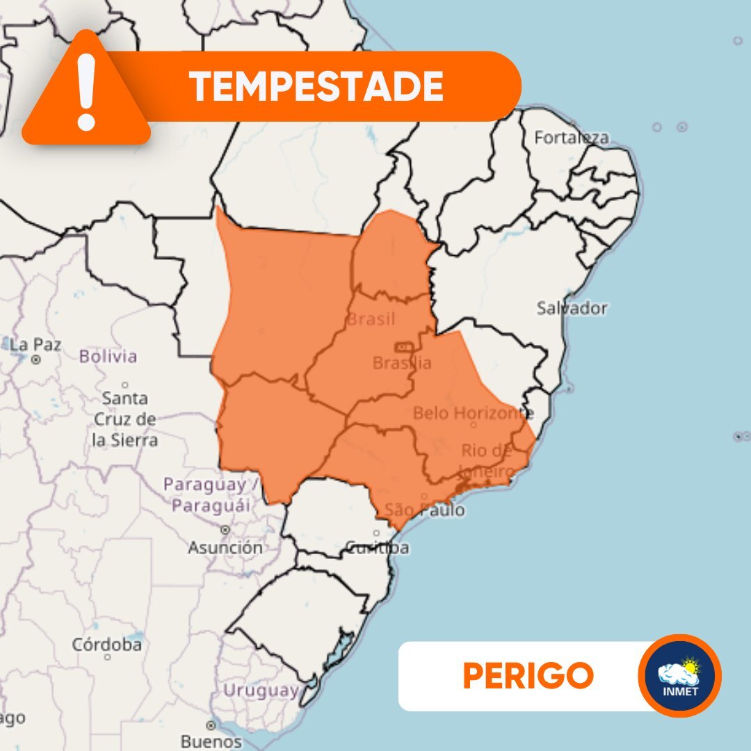 Por fim, no domingo (19), a previsão do Inmet coloca Goiás em alerta laranja, de perigo, para tempestade na região. É esperado chuva entre 30 e 60 mm/h ou 50 e 100 mm/dia, ventos intensos (60-100 km/h), e queda de granizo.