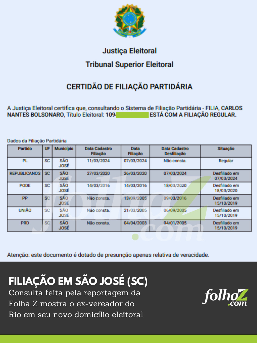 O ex-vereador do Rio de Janeiro Carlos Bolsonaro (PL) transferiu seu título de eleitor para a cidade de São José (SC), na Região Metropolitana de Florianópolis.
