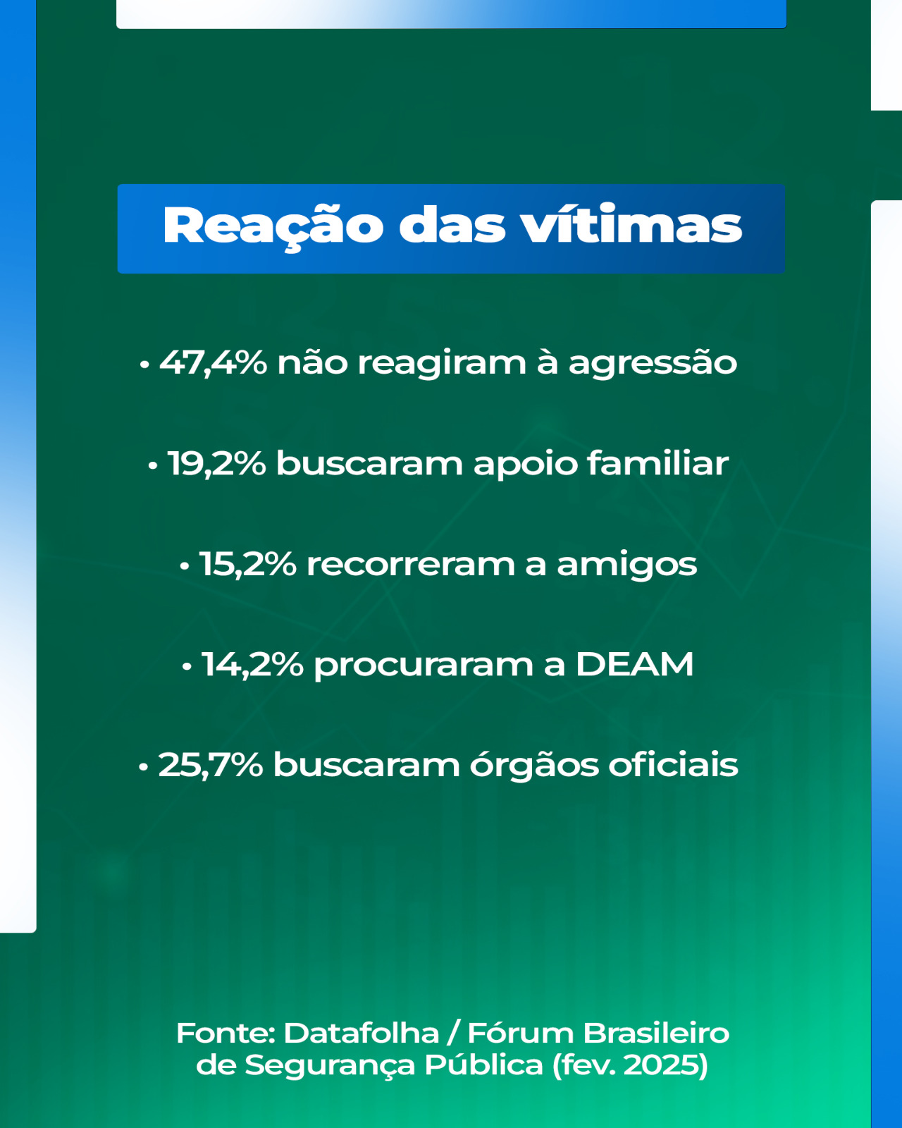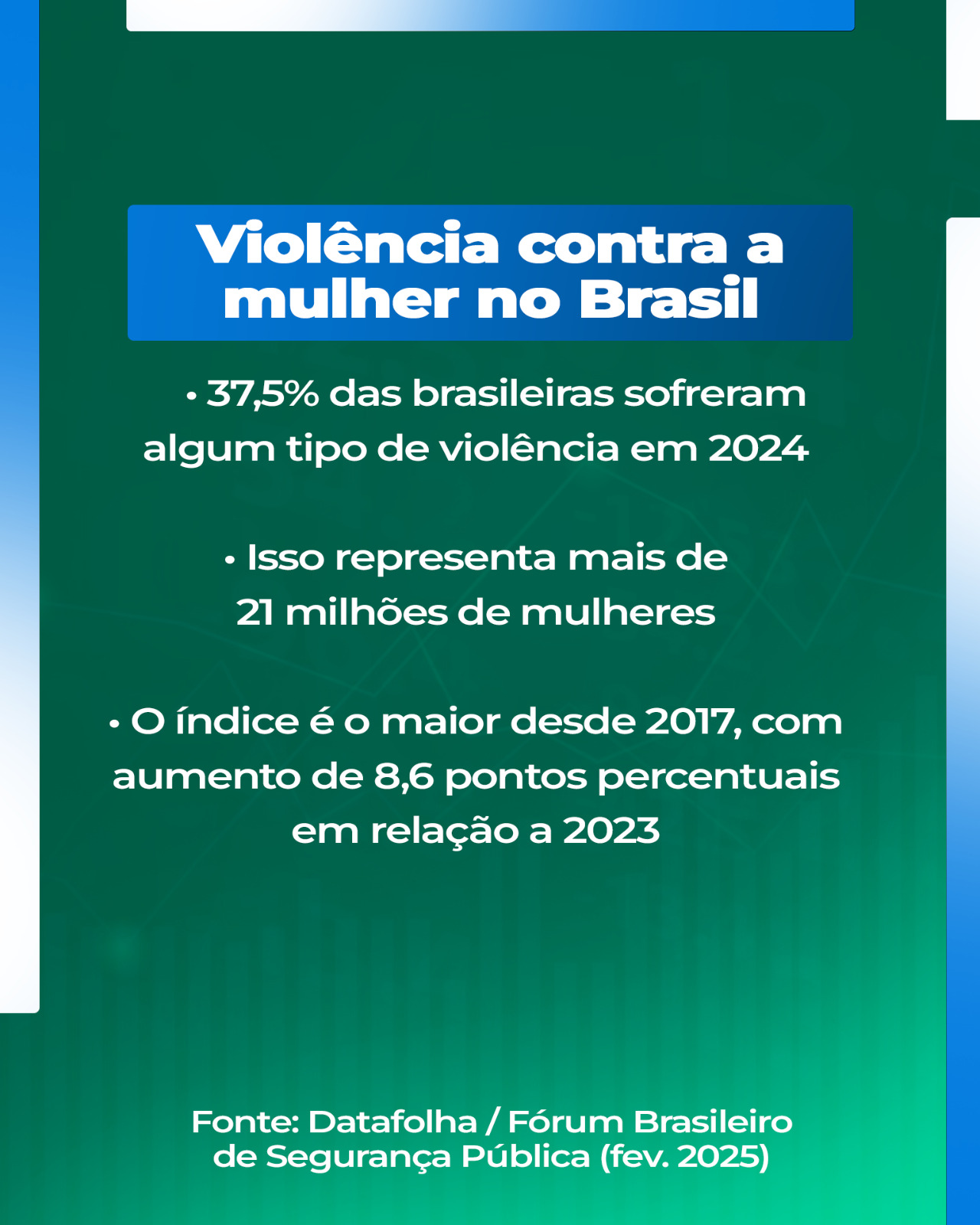 Complementando esses dados, uma pesquisa do Datafolha, encomendada pelo Fórum Brasileiro de Segurança Pública e divulgada em fevereiro deste ano, revelou que mais de 21 milhões de brasileiras, cerca de 37,5% das mulheres, sofreram algum tipo de violência nos últimos 12 meses.