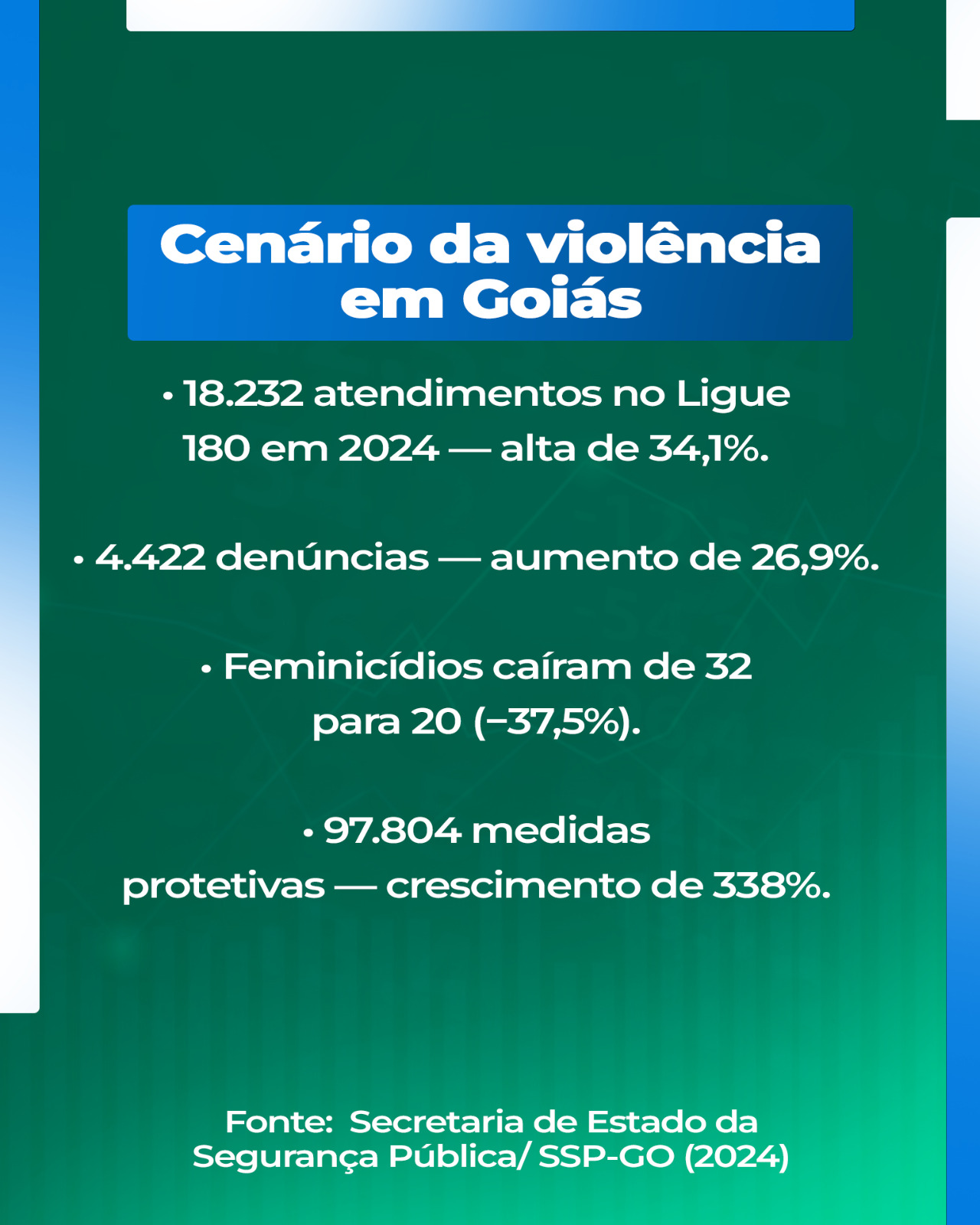 Em Goiás, o canal Ligue 180 registrou, em 2024, 18.232 atendimentos, um aumento de 34,1% em relação a 2023 (13.588). As denúncias passaram de 3.483 para 4.422, acréscimo de 26,9%.