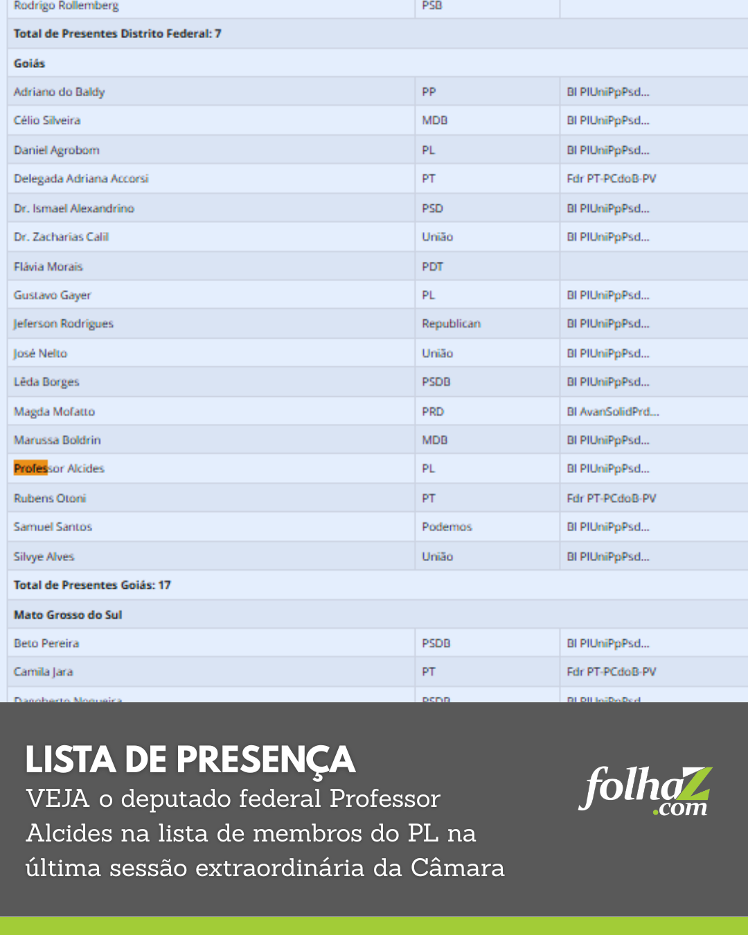 deputado federal Professor Alcides continua registrado como membro do PL nas listas de presença e nas votações da Câmara dos Deputados e do Congresso Nacional.