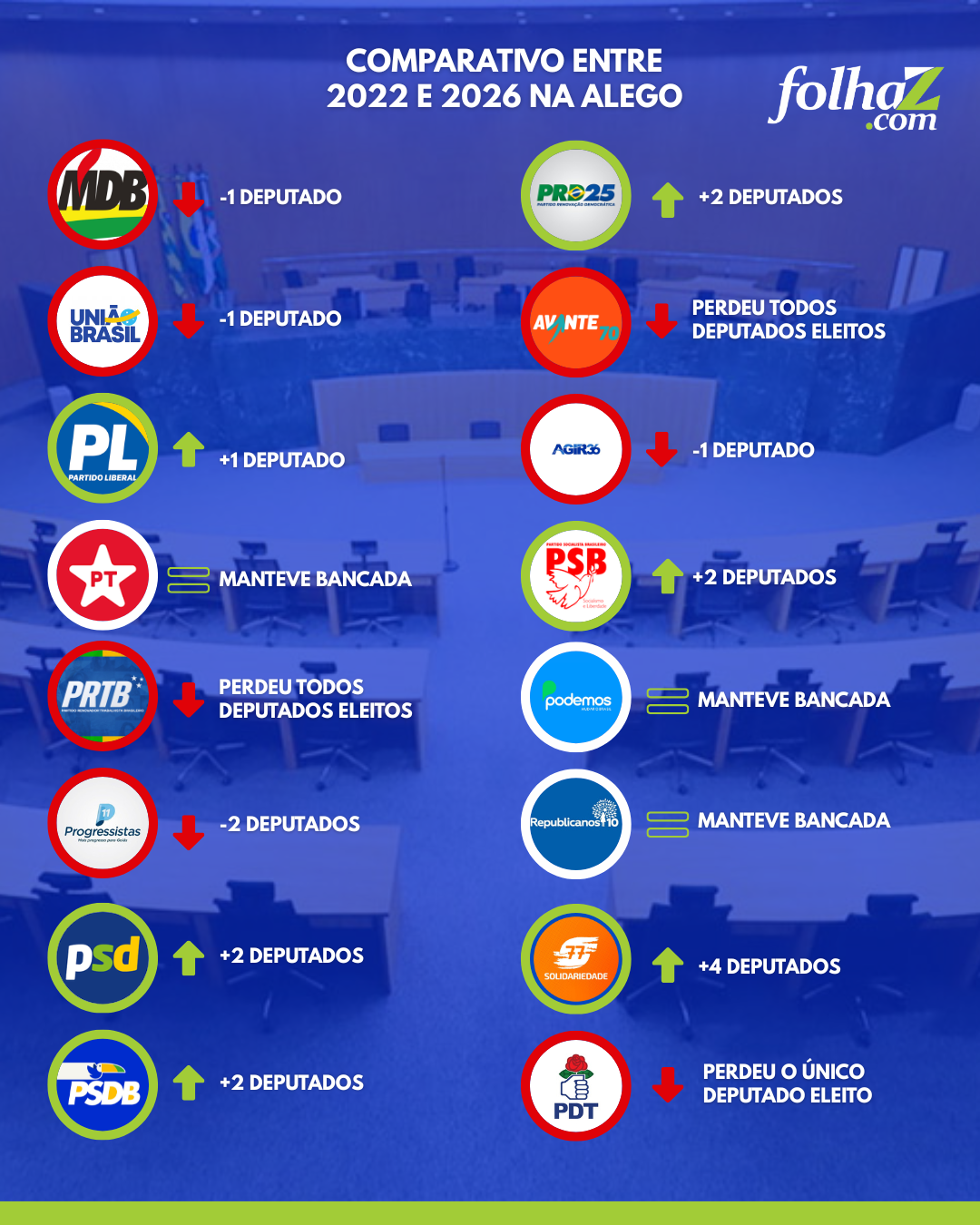 Com as mudanças ocorridas desde 2022 e durante a chamada janela partidária, a federação formada por PRD e Solidariedade passa a ter a maior bancada da Alego no último ano da atual legislatura.