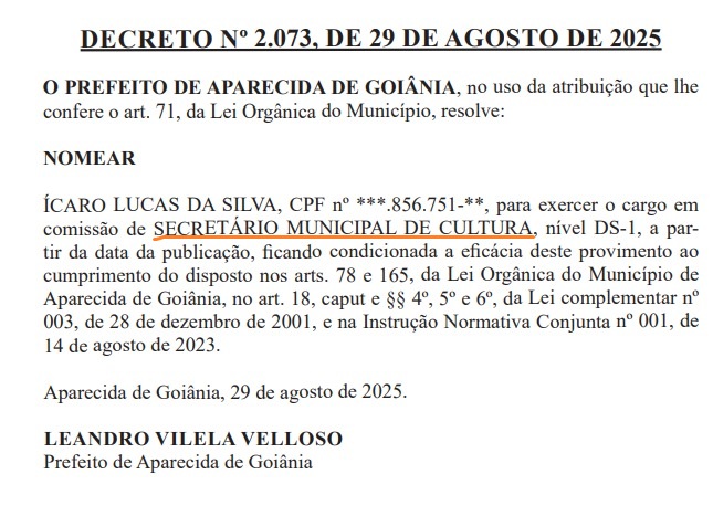 Conforme antecipado pela Folha Z, nesta 6ª feira (29), Ícaro Lucas da Silva — filho do ex-deputado estadual Marlúcio Pereira — foi nomeado secretário de Cultura de Aparecida.