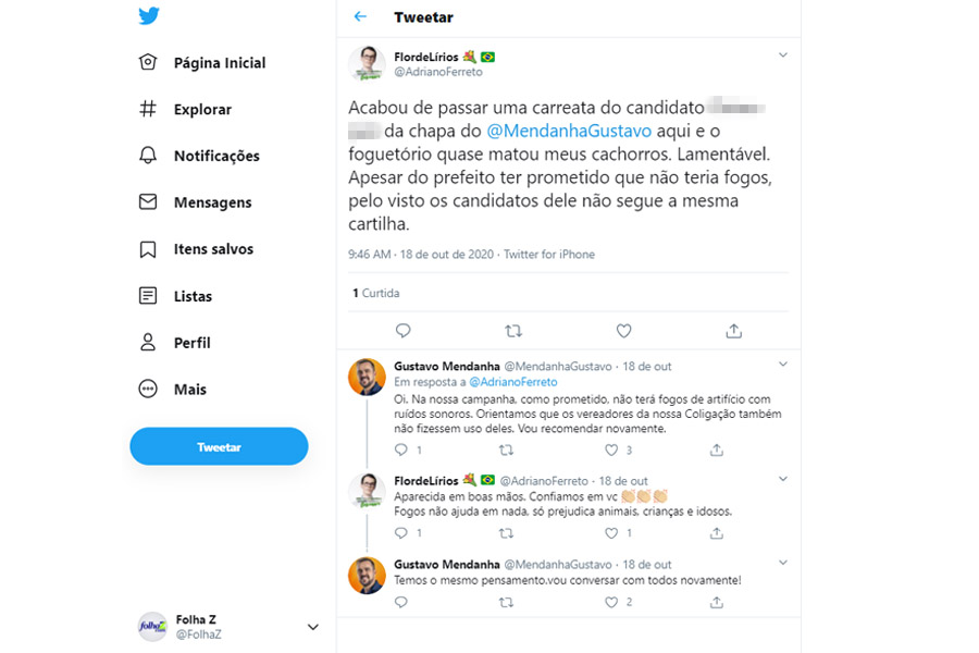 “Acabou de passar uma carreata do candidato da chapa do @MendanhaGustavo aqui e o foguetório quase matou meus cachorros. Lamentável. Apesar do prefeito ter prometido que não teria fogos, pelo visto os candidatos dele não segue [SIC] a mesma cartilha”, escreveu o internauta no domingo (18).