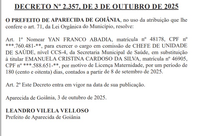 O prefeito de Aparecida de Goiânia, Leandro Vilela, nomeou Yan Franco Abadia como novo diretor da Unidade de Pronto Atendimento (UPA) Brasicon, localizada no Residencial Brasicon.