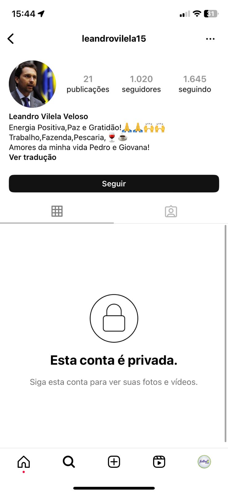 Perfil de Leandro Vilela no Instagram segue trancado | Foto: Reprodução