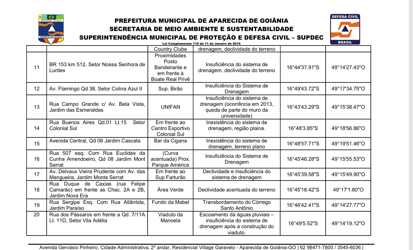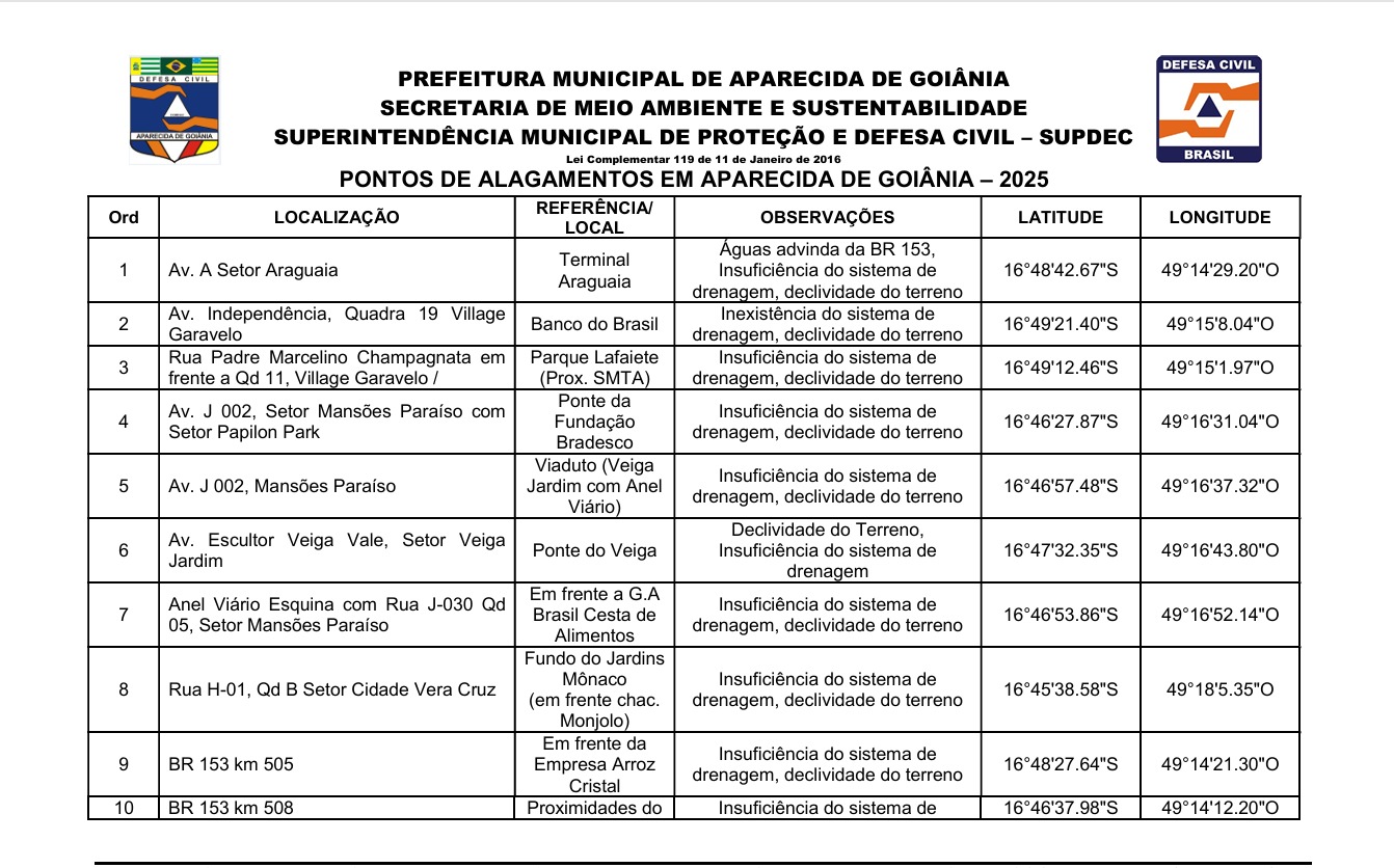 No final de setembro, a Defesa Civil de Aparecida divulgou estudo técnico apontando 33 pontos com possibilidade de alagamentos, 24 de risco, que são locais não habitados, e outros 16 em regiões com edificações.