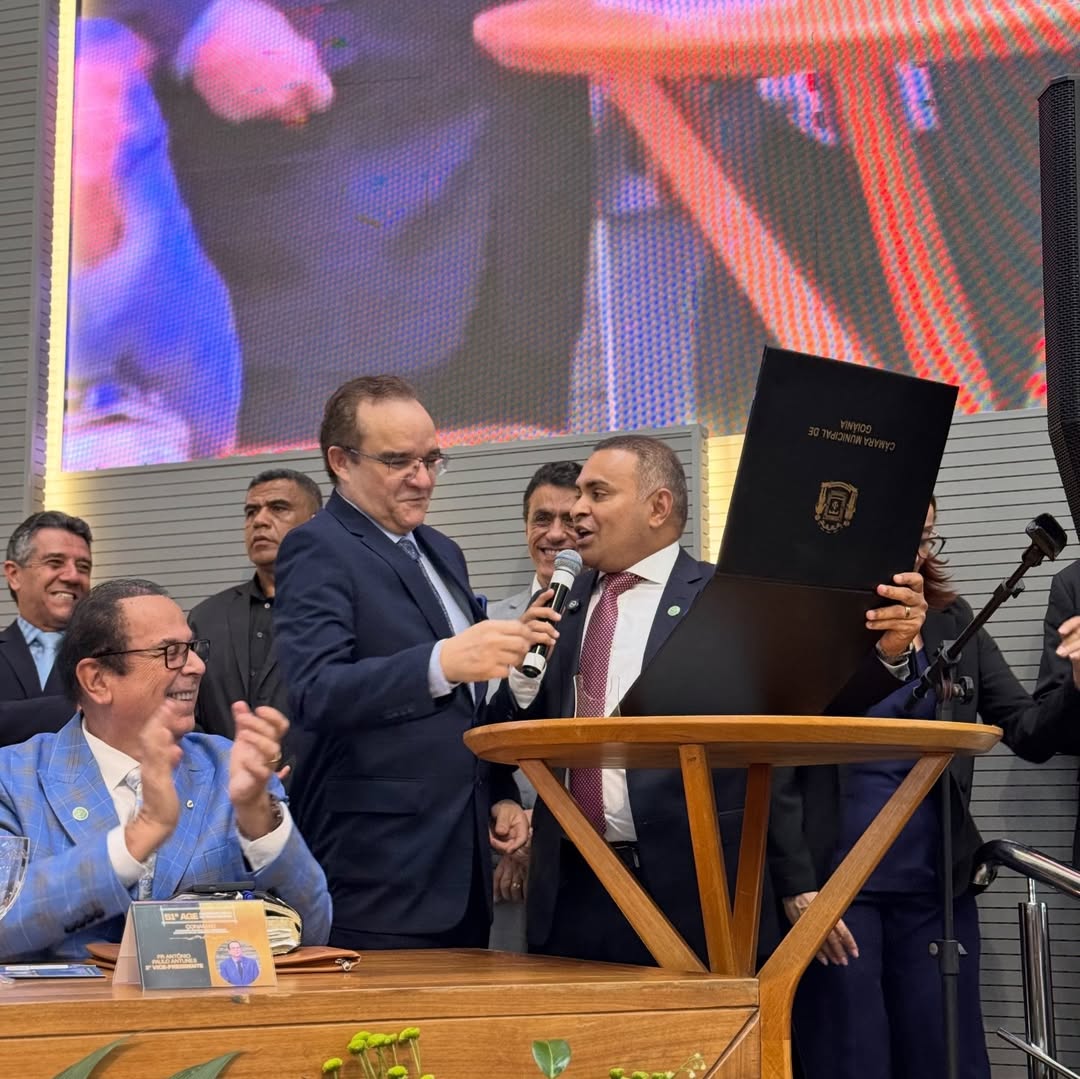O vereador Ronilson Reis (Solidariedade) entregou um título de cidadão goianiense para o presidente da Assembleia de Deus Madureira, Abner Cássio Ferreira.