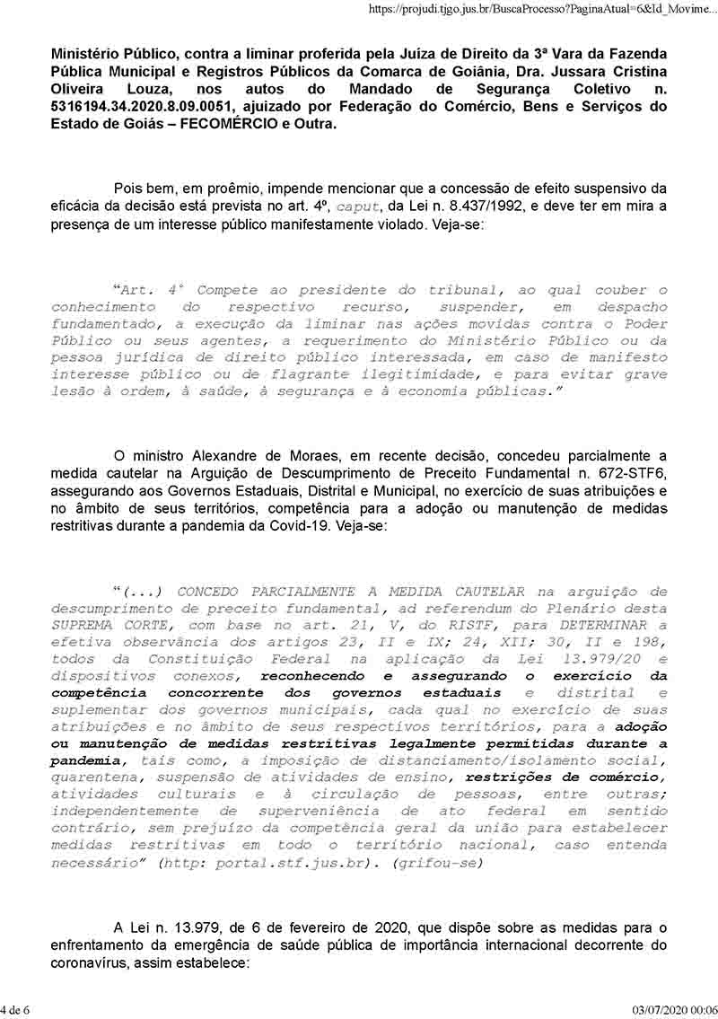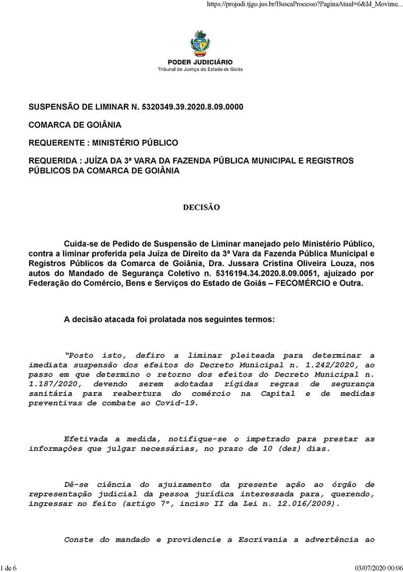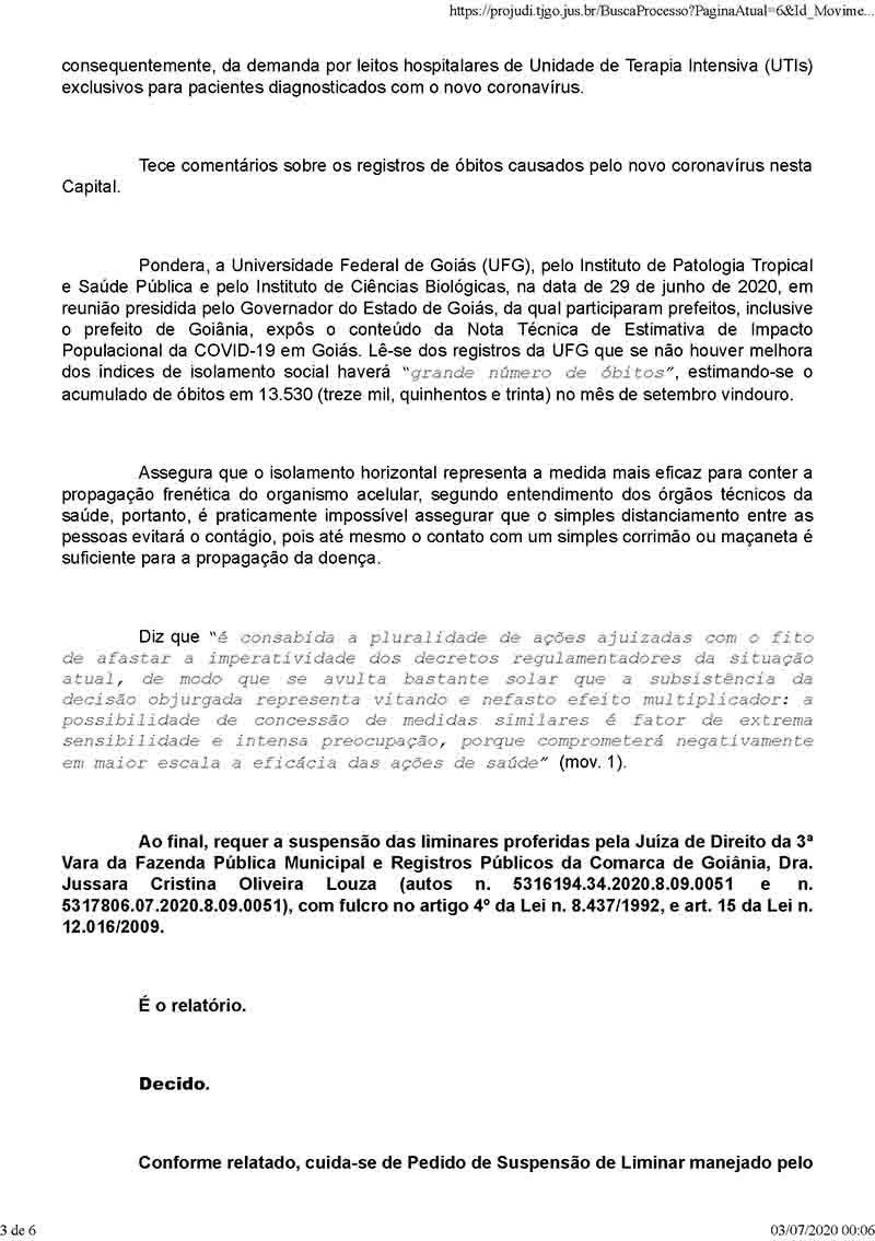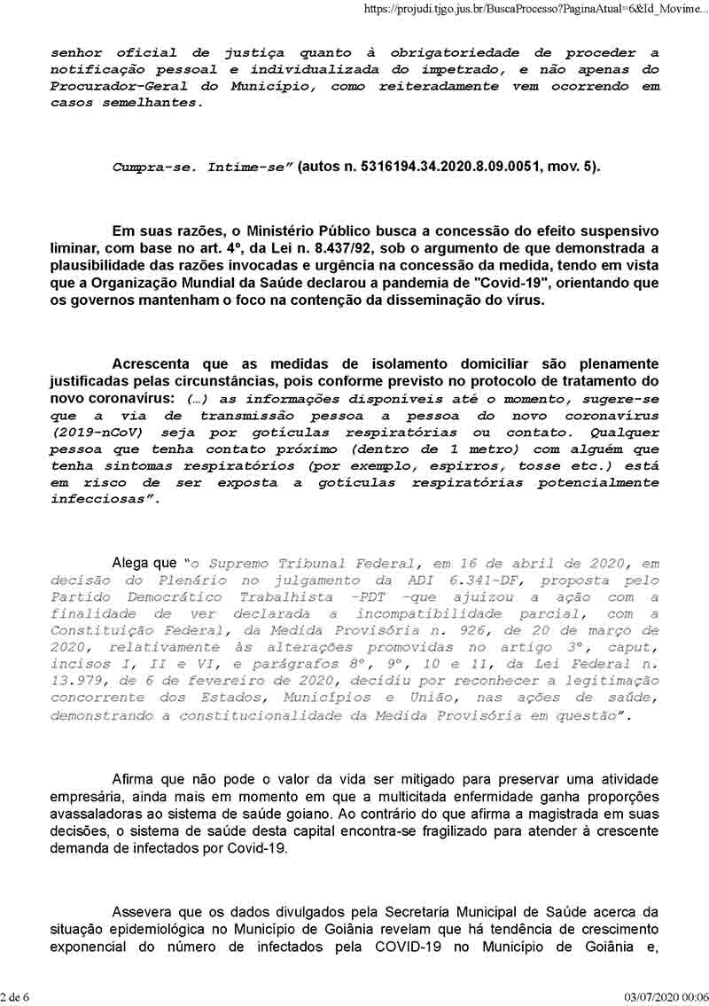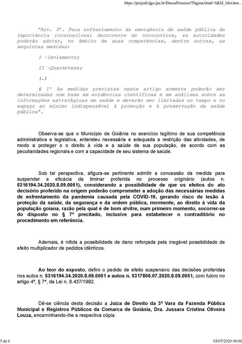Na decisão, por sua vez, o desembargador pontuou que “o Município de Goiânia, no exercício legítimo de sua competência administrativa e legislativa, entendeu necessária e adequada a restrição das atividades, de modo a proteger o o direito à vida e a saúde de sua população, de acordo com as peculiaridades regionais e com a capacidade de seu sistema de saúde”.